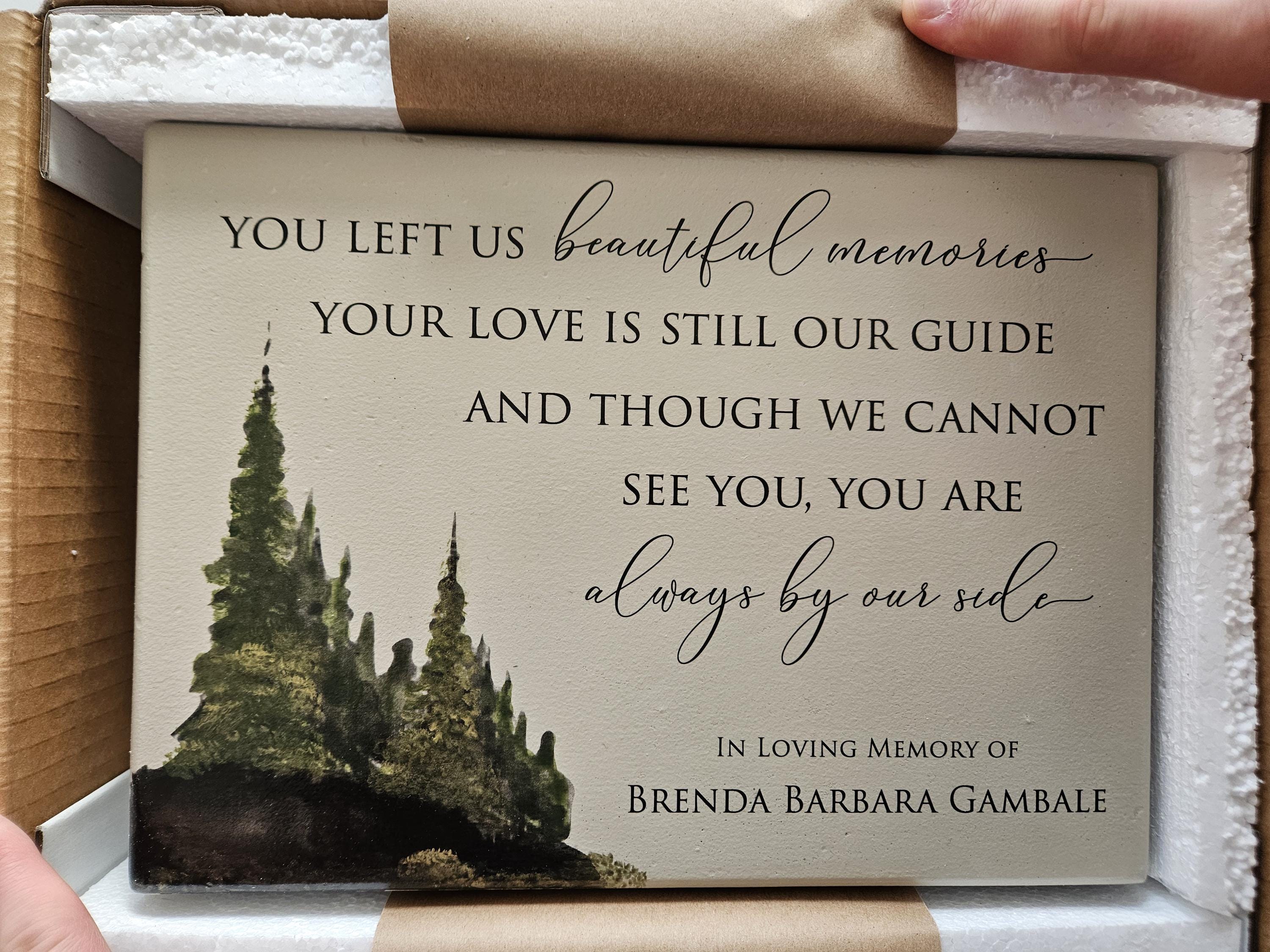 Beautifully designed, this is a heartfelt memorial gift that will be treasured for years to come. Made of concrete, with high quality inks and artistically hand-painted accents, it is a heavy piece that can easily stand up a shelf or be placed in a garden outside. It has a feeling of being slightly rustic yet extremely classy. The main message and design will remain and the personalized portion can be submitted in the box provided. Any length of name(s) and date can be accommodated. It will be fully sealed and can go outside. Free pads are also included for indoor use.