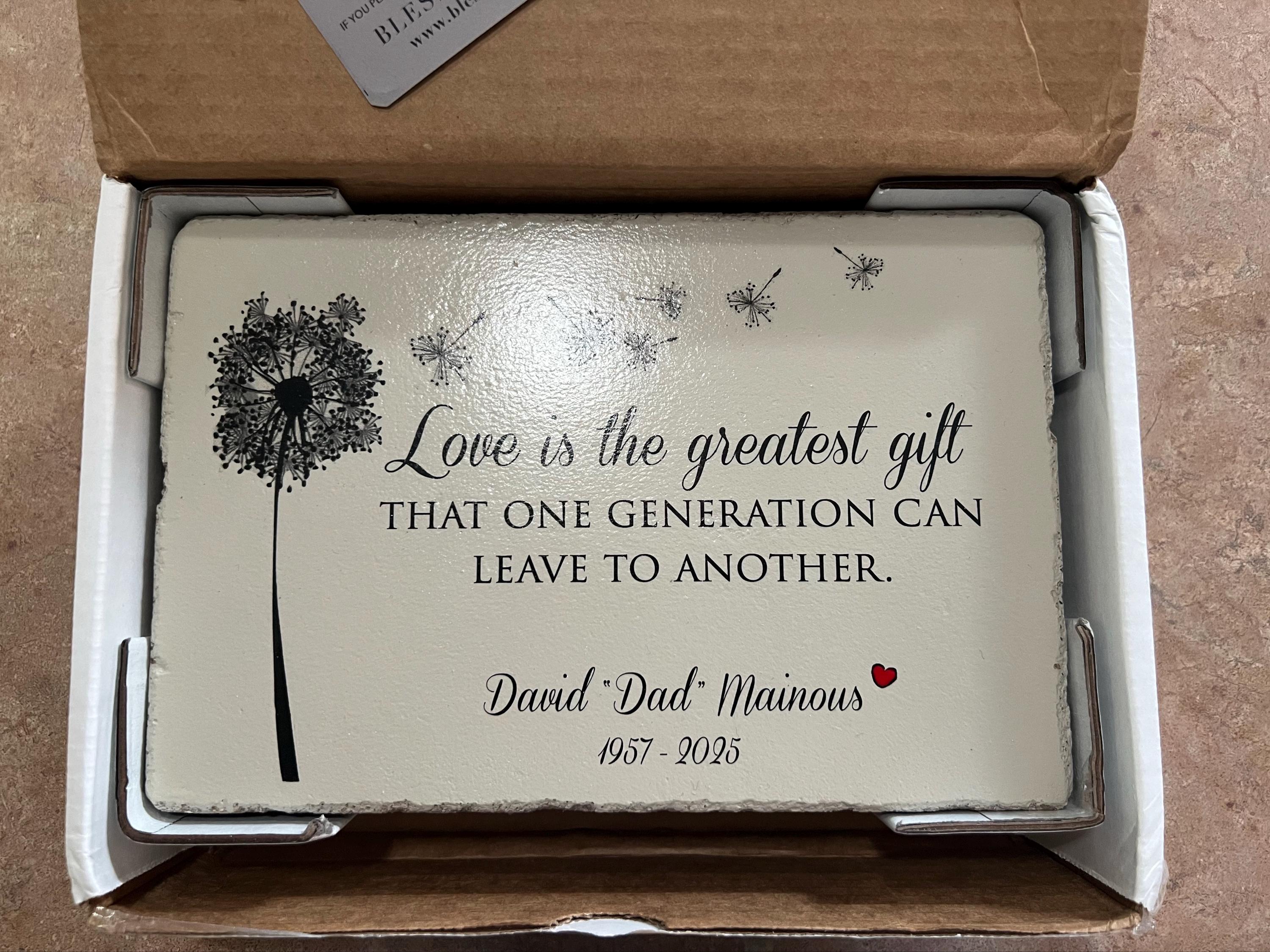 Beautifully designed, this is a heartfelt memorial gift that will be treasured for years to come. Made of concrete, with high quality inks and artistically hand-painted accents, it is a heavy piece that can easily stand up a shelf or be placed in a garden outside. It has a feeling of being slightly rustic yet extremely classy. The main message and design will remain and the personalized portion can be submitted in the box provided. Any length of name(s) and date can be accommodated. It will be fully sealed and can go outside. Free pads are also included for indoor use.