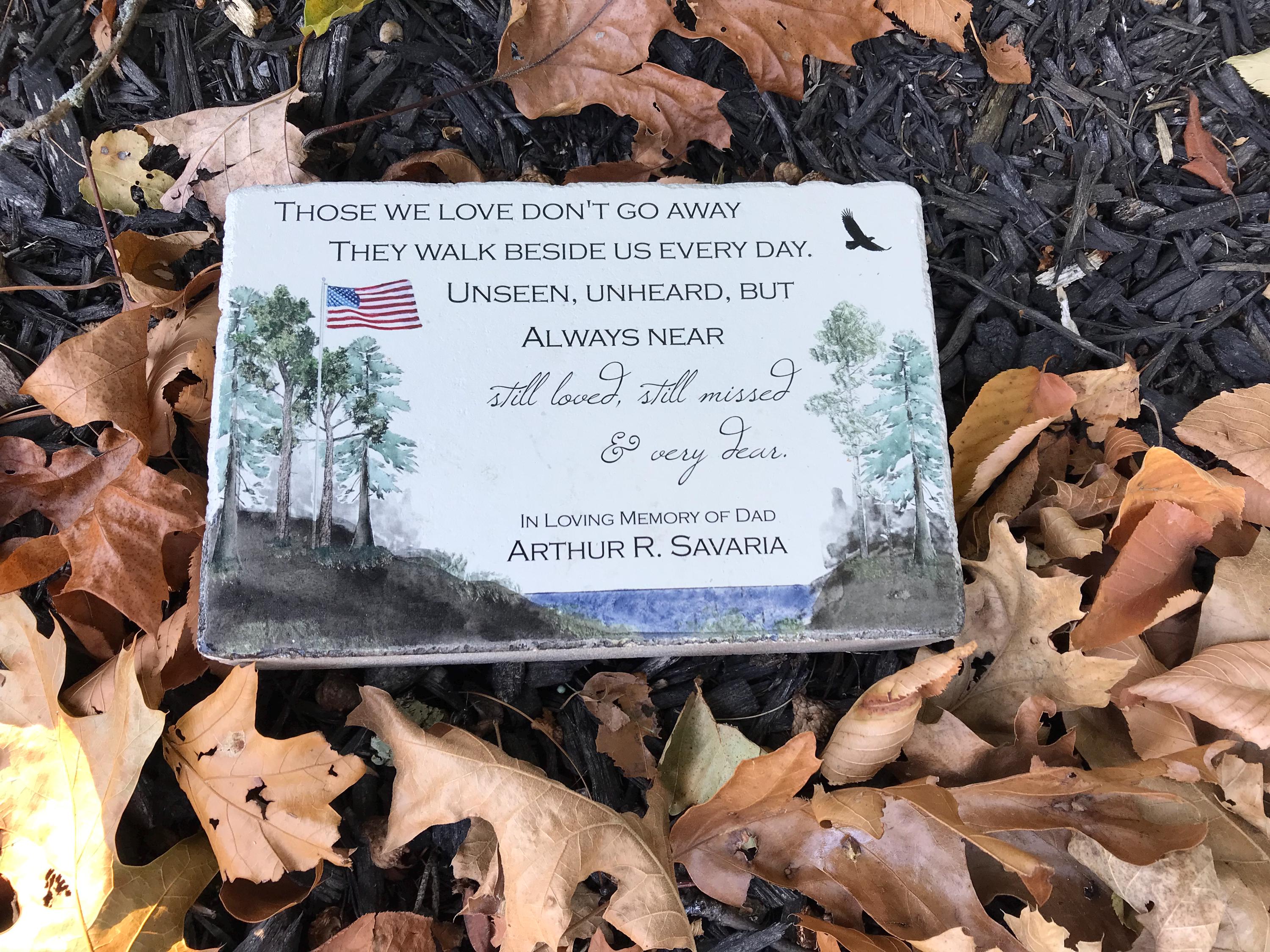 Beautifully designed, this is a heartfelt memorial gift that will be treasured for years to come. Made of concrete, with high quality inks and artistically hand-painted accents, it is a heavy piece that can easily stand up a shelf or be placed in a garden outside. It has a feeling of being slightly rustic yet extremely classy. The main message and design will remain and the personalized portion can be submitted in the box provided. Any length of name(s) and date can be accommodated. It will be fully sealed and can go outside. Free pads are also included for indoor use.