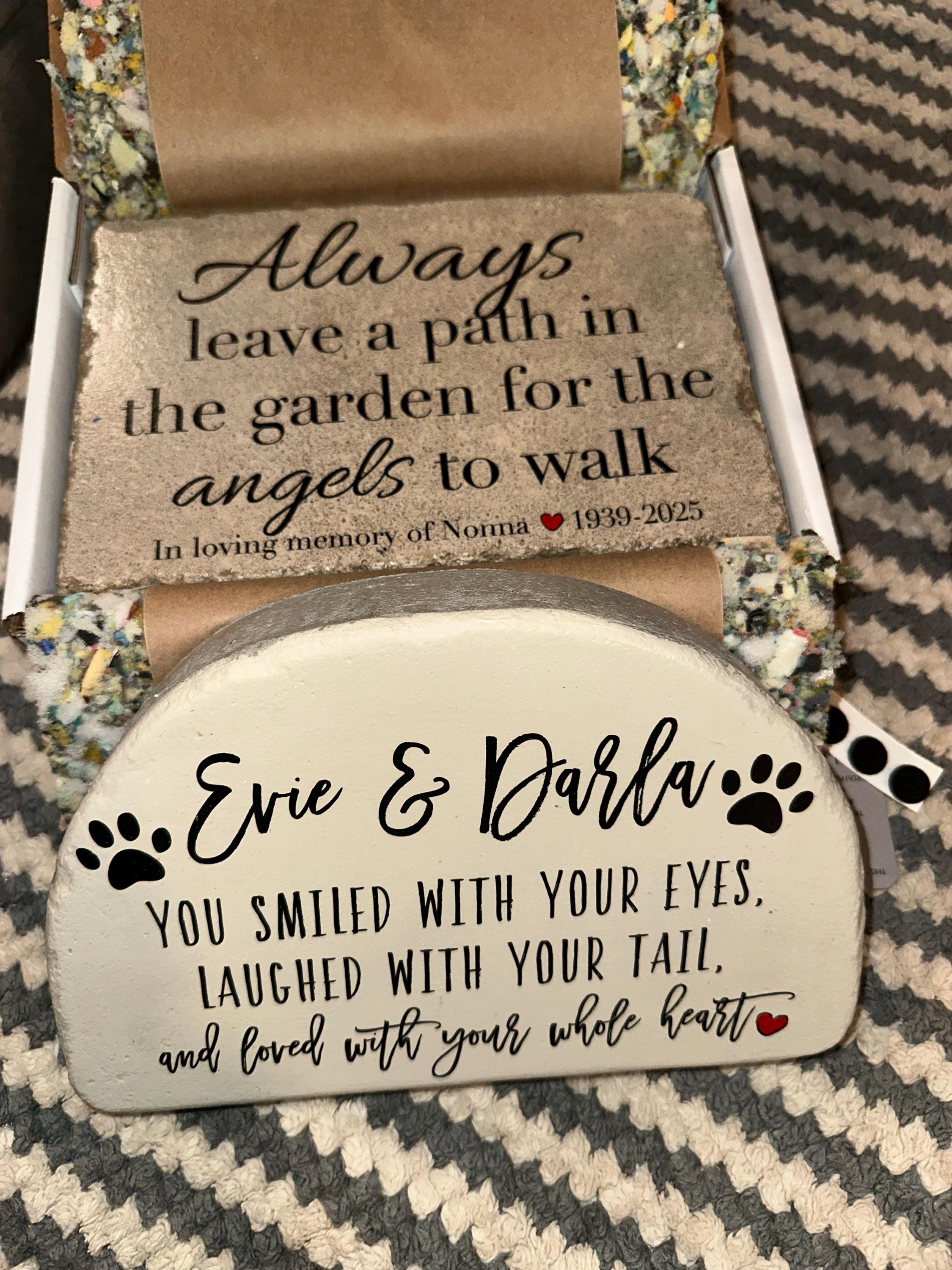 Exclusively designed by Blessing and Light, these rainbow shaped concrete memorial stones are a beautiful way to remember and honor a beloved pet. Each is individually handcrafted with crisp lettering and hand painted accents of color. Fully sealed on all sides, it is outdoor safe. It would look just as beautiful in a garden or on a shelf by a picture of the beloved pet. This is a keepsake quality item that will be treasured for many years to come.